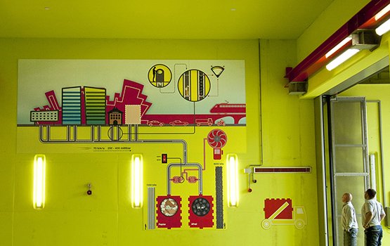 In het stationsgebied van Arnhem werkt men met een ondergronds afval transport systeem (OAT). Omdat vuilniswagens het gebied niet in kunnen - en ook om andere redenen ongewenst zijn - is een soort buizenpost voor afvalzakken bedacht. Het schijnt behoorlijk uniek te zijn want er komen bussen mensen langs om het te bekijken. Maar ja, ondergronds dus niet zo veel te zien. Wij maakten een enorme schematische voorstelling op de muur bij de entree waarop het principe wordt uitgelegd.